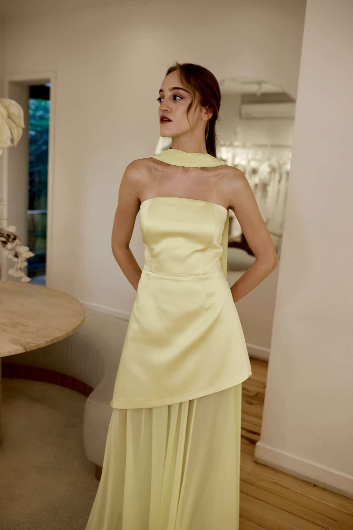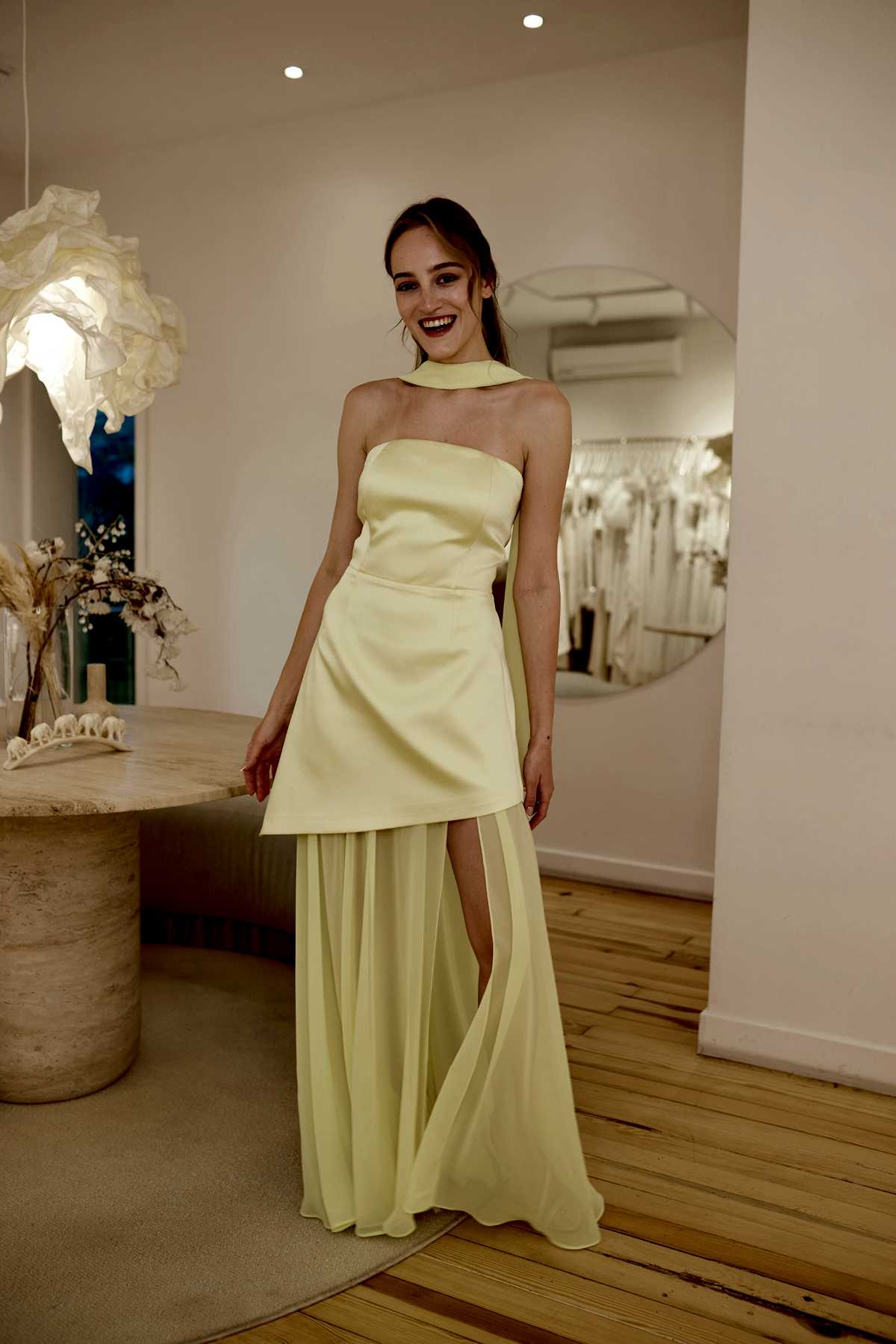 RTNC markasına straplez şifon etekli sarı elbise